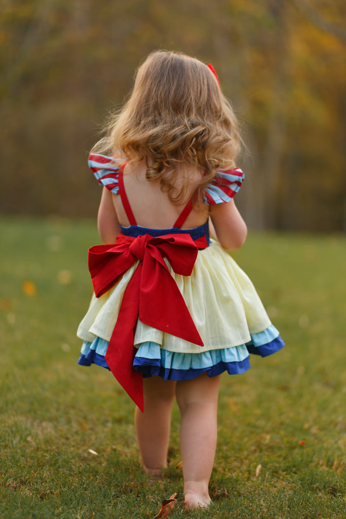 🍎 Snow White Inspired Skirted Romper – Handmade Fairytale Magic for Little Girls 💛💙❤️